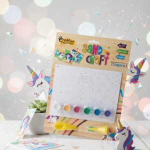 The product shown in the image is a “Creative Factory Sand Craft Unicorn” art kit, a creative activity set designed for children. This kit appears to include a pre-printed adhesive ...