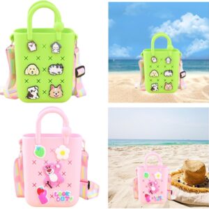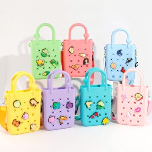 The image displays a yellow silicone mini sling bag. This type of bag is designed for children and teens and often comes with various decorative charms. Material: The bag ...