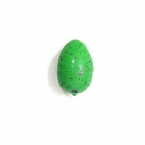The object pictured is the packaging for a “Gazillion Bubbles Dino Egg” product. It is a bright, vibrant green, egg-shaped plastic container with small dark speckles and a small ...