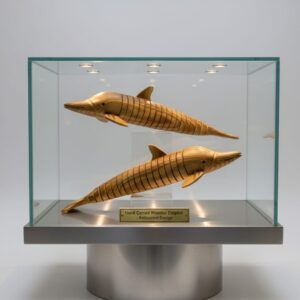 The product in the image is a decorative, hand-carved wooden fish figurine. The sculpture is made from natural wood, featuring a polished finish that highlights the inherent wood grain. It has ...